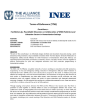 The aim of this consultancy is to effectively design, facilitate and document discussions during a joint education/child protection 2-day roundtable in October 2018. The Inter-Agency Network of Education in Emergencies (INEE) and the Alliance for Child Protection in Humanitarian Action (the Alliance) are organizing a joint event where practitioners, academics, donors, and policy makers will come together to explore opportunities for joint and integrated education and child protection programming in humanitarian settings.