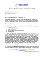 New Editions Consulting, Inc. is recruiting a new Senior Technical Advisor for Children in Adversity. The Senior Technical Advisor assists with the administration of USAID’s Displaced Children and Orphans Fund, as well as the U.S. Government Action Plan on Children in Adversity (APCA) more broadly. Public Law 109-95: The Assistance for Orphans and Other Vulnerable Children in Developing Countries Act of 2005 (PL 109-95) calls for a comprehensive, coordinated, and effective response on the part of the U.S. Government to the world’s most vulnerable children, and for USAID to house the U.S. Government Special Advisor on Children in Adversity. PL 109-95 also requires an interagency strategy to guide the diverse portfolio of assistance for children that is channeled through more than 30 offices within seven U.S. government departments and agencies. The Senior Technical Advisor will support the Special Advisor to fulfill the legislative requirements set forth under Public Law 109-95, particularly interagency coordination, the implementation of a whole-of-government strategy, and the promotion of partnerships that seek to improve the wellbeing of children in adversity. For more information, view the attachment above.