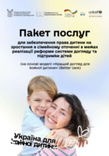 This document outlines a minimum package of social services aimed at preventing child-family separation, supporting reintegration of children from institutional care into families, and sustaining family-based care. The package includes eight core services: resilience-building support; accompaniment for families raising orphans; early intervention; inclusive education assistance; day care for children with disabilities; social support for families in difficult life circumstances; social integration for care leavers; and supported living for young people with disabilities.